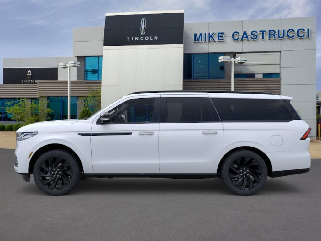 This 2025 Lincoln Navigator L Reserve comes equipped with Equipment Group 202A Reserve II, Jet Appearance Package (Black Accent Badge, Black Accent Interior Pack, Black Beltline Molding, Black Painted Roof Rails, Front Bumper Fascia, Lincoln Lit Star, Unique Lincoln Grille Pillar Black Surround, and Wheels: 22" High-Gloss Ebony Aluminum), 4WD, P2 Premium Black Onyx Leather, 28 Speakers, 3rd row seats: split-bench, 4-Wheel Disc Brakes, ABS brakes, Adaptive suspension, Adjustable pedals, Air Conditioning, Alloy wheels, AM/FM radio: SiriusXM with 360L, Apple CarPlay/Android Auto, Audio memory, Auto High-beam Headlights, Auto Htd & Ventilated Premium Lthr Captain's Chair, Auto Start-Stop Technology, Auto tilt-away steering wheel, Auto-dimming door mirrors, Auto-dimming Rear-View mirror, Auto-leveling suspension, Automatic temperature control, Brake assist, Bumpers: body-color, Compass, Delay-off headlights, Driver door bin, Driver vanity mirror, Driver's Seat Mounted Armrest, Dual front impact airbags, Dual front side impact airbags, Electronic Stability Control, Emergency communication system: 911 Assist, Exterior Parking Camera Rear, Four wheel independent suspension, Front anti-roll bar, Front Bucket Seats, Front dual zone A/C, Front reading lights, Fully automatic headlights, Garage door transmitter, Head restraints memory, Heated door mirrors, Heated front seats, Heated rear seats, Heated steering wheel, HVAC memory, Illuminated entry, Leather steering wheel, Lincoln Connect, Lincoln Premium Connectivity, Low tire pressure warning, Memory seat, Navigation system: Connected Navigation (1-year trial), Occupant sensing airbag, Outside temperature display, Overhead airbag, Overhead console, Panic alarm, Passenger door bin, Passenger seat mounted armrest, Passenger vanity mirror, Pedal memory, Power adjustable front head restraints, Power adjustable rear head restraints, Power door mirrors, Power driver seat, Power moonroof, Power passenger seat, Power steering, Power windows, Radio data system, Radio: Revel Ultima 3D AM/FM/HD Audio System, Rain sensing wipers, Rear air conditioning, Rear anti-roll bar, Rear audio controls, Rear reading lights, Rear window defroster, Rear window wiper, Reclining 3rd row seat, Remote keyless entry, Security system, SiriusXM w/360L, Speed control, Speed-sensing steering, Speed-Sensitive Wipers, Split folding rear seat, Spoiler, Steering wheel memory, Steering wheel mounted audio controls, Tachometer, Telescoping steering wheel, Tilt steering wheel, Traction control, Trip computer, Turn signal indicator mirrors, Variably intermittent wipers, Ventilated front seats, and Wheels: 22" Dark Tarnished Aluminum.