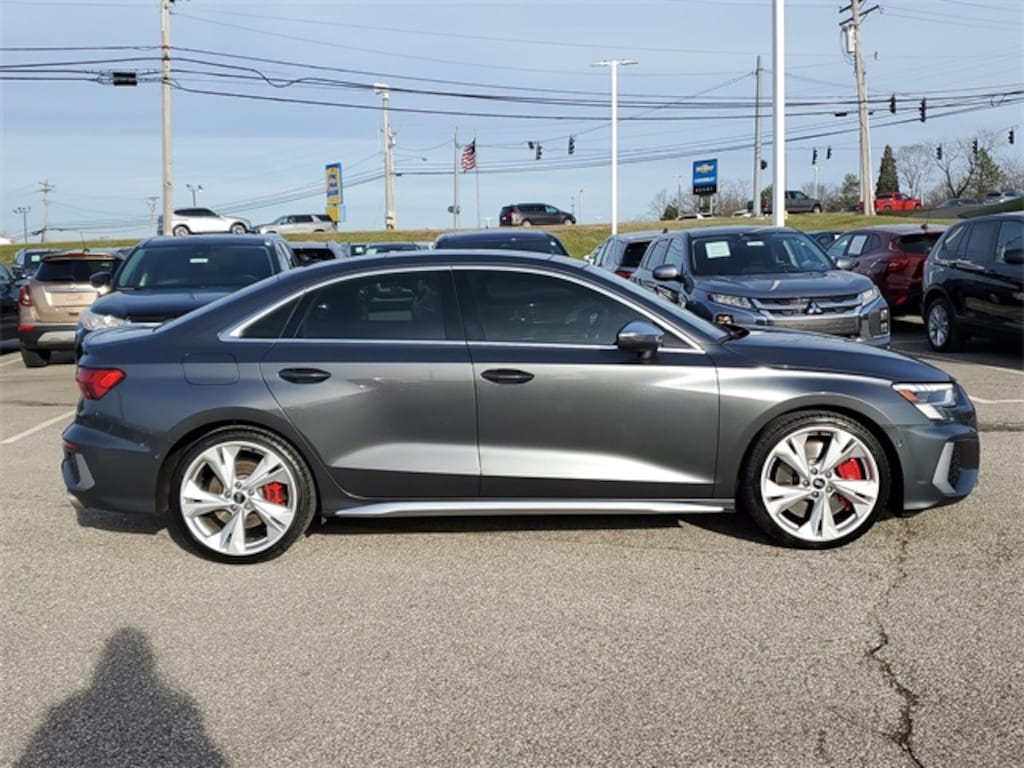 This 2022 Audi S3 2.0T Prestige comes equipped with 4-Wheel Disc Brakes, 6 Speakers, ABS brakes, Air Conditioning, Alloy wheels, AM/FM radio, Auto High-beam Headlights, Automatic temperature control, Brake assist, Bumpers: body-color, Compass, Delay-off headlights, Driver door bin, Driver vanity mirror, Dual front impact airbags, Dual front side impact airbags, Electronic Stability Control, Emergency communication system: Audi connect CARE, Exterior Parking Camera Rear, Four wheel independent suspension, Front anti-roll bar, Front Bucket Seats, Front Center Armrest, Front dual zone A/C, Front fog lights, Front reading lights, Fully automatic headlights, Heated door mirrors, Heated front seats, Heated Front Sport Seats, Illuminated entry, Knee airbag, Leather Seating Surfaces, Leather steering wheel, Low tire pressure warning, Occupant sensing airbag, Outside temperature display, Overhead airbag, Overhead console, Panic alarm, Passenger door bin, Passenger vanity mirror, Power door mirrors, Power driver seat, Power moonroof, Power passenger seat, Power steering, Power windows, Radio data system, Radio: Audi Sound System, Rain sensing wipers, Rear air conditioning, Rear anti-roll bar, Rear fog lights, Rear reading lights, Rear seat center armrest, Rear window defroster, Remote keyless entry, Speed control, Speed-sensing steering, Speed-Sensitive Wipers, Split folding rear seat, Spoiler, Steering wheel mounted audio controls, Tachometer, Telescoping steering wheel, Tilt steering wheel, Traction control, Trip computer, Turn signal indicator mirrors, Variably intermittent wipers, and Wheels: 18" 5-Arm-Flag Design.