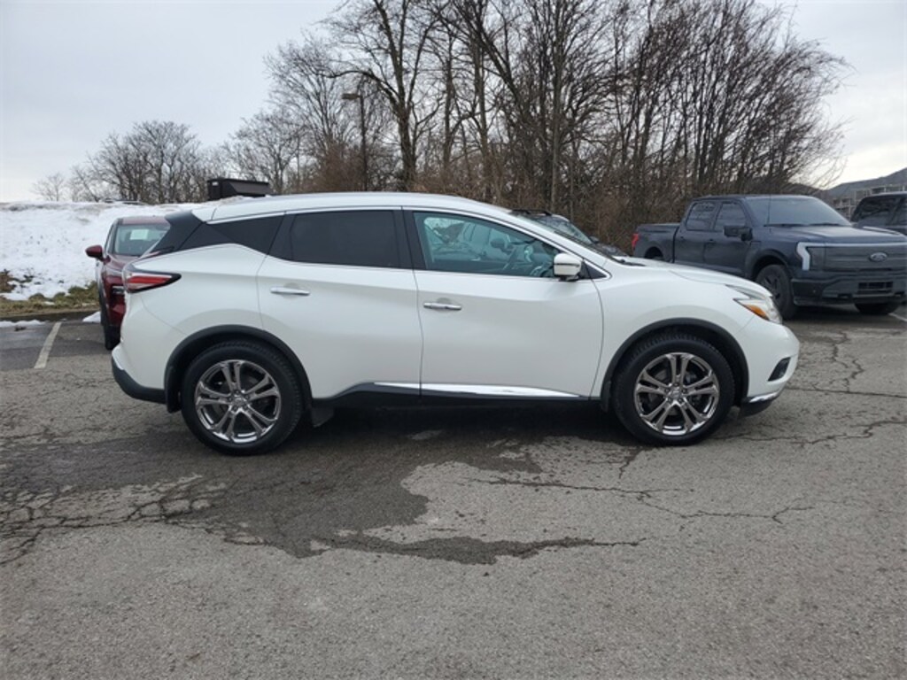 This 2016 Nissan Murano Platinum comes equipped with Cargo Package, Platinum Technology Package (Intelligent Cruise Control and Predictive Forward Collision Warning (PFCW)), CVT with Xtronic, AWD, 11 Speakers, 4-Wheel Disc Brakes, 4.677 Axle Ratio, ABS brakes, Activation Disclaimer, Air Conditioning, Alloy wheels, AM/FM radio: SiriusXM, Auto tilt-away steering wheel, Auto-dimming Rear-View mirror, Automatic temperature control, Brake assist, Bumpers: body-color, Carpeted Floor Mats & Cargo Mat, CD player, Child-Seat-Sensing Airbag, Compass, Delay-off headlights, Driver door bin, Driver vanity mirror, Dual front impact airbags, Dual front side impact airbags, Electronic Stability Control, Four wheel independent suspension, Front anti-roll bar, Front Bucket Seats, Front Center Armrest, Front dual zone A/C, Front fog lights, Front reading lights, Fully automatic headlights, Garage door transmitter: HomeLink, Heated & Cooled Front Bucket Seats, Heated door mirrors, Heated front seats, Heated rear seats, Heated steering wheel, Illuminated entry, Illuminated Kick Plates (DISC), Interior Accent Lighting, Knee airbag, Leather Appointed Seat Trim, Low tire pressure warning, Memory seat, Navigation System, Occupant sensing airbag, Outside temperature display, Overhead airbag, Overhead console, Panic alarm, Passenger door bin, Passenger vanity mirror, Power door mirrors, Power driver seat, Power Liftgate, Power passenger seat, Power steering, Power windows, Radio data system, Radio: AM/FM/CD Audio System w/Navigation, Rear anti-roll bar, Rear reading lights, Rear seat center armrest, Rear window defroster, Rear window wiper, Remote keyless entry, Roof rack: rails only, Security system, Special Paint - Pearl White, Speed control, Speed-sensing steering, Speed-Sensitive Wipers, Splash Guards, Split folding rear seat, Spoiler, Steering wheel memory, Steering wheel mounted audio controls, Tachometer, Telescoping steering wheel, Tilt steering wheel, Traction control, Trip computer, Turn signal indicator mirrors, Variably intermittent wipers, Ventilated front seats, Wheels: 20" Machined Aluminum-Alloy, and Wheels: 20" Split 5-Spoke Bright PVD Alloy.